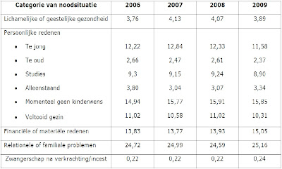 Uit de tabel blijken persoonlijke redenen en relationele of familiale redenen de vaakst ingeroepen noodsituaties te zijn. De meeste vrouwen geven trouwens meerdere noodsituaties op om hun abortus te verantwoorden. De meest voorkomende redenen voor een abortus zijn: te jong, momenteel geen kinderwens, voltooid gezin, financiële of materiële redenen en relationele of familiale problemen.